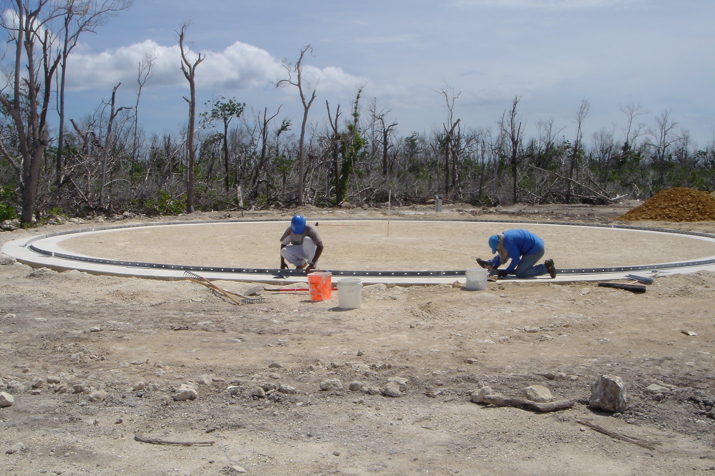 For each ModuTank model, although a full concrete pad is never required, clients may elect to use existing pads, or pour formal foundations. Round tank installations can utilize a simple 4-foot-diameter concrete ring wall, with compacted earth remaining at center. The same idea may be followed on our square and rectangular tanks, where a perimeter concrete apron can support the structural support frames, and compacted earth fills in the remaining space. This approach can significantly reduce construction costs, when a concrete slab is not already present. Please see examples of these foundation types, in the following photos and drawings:
